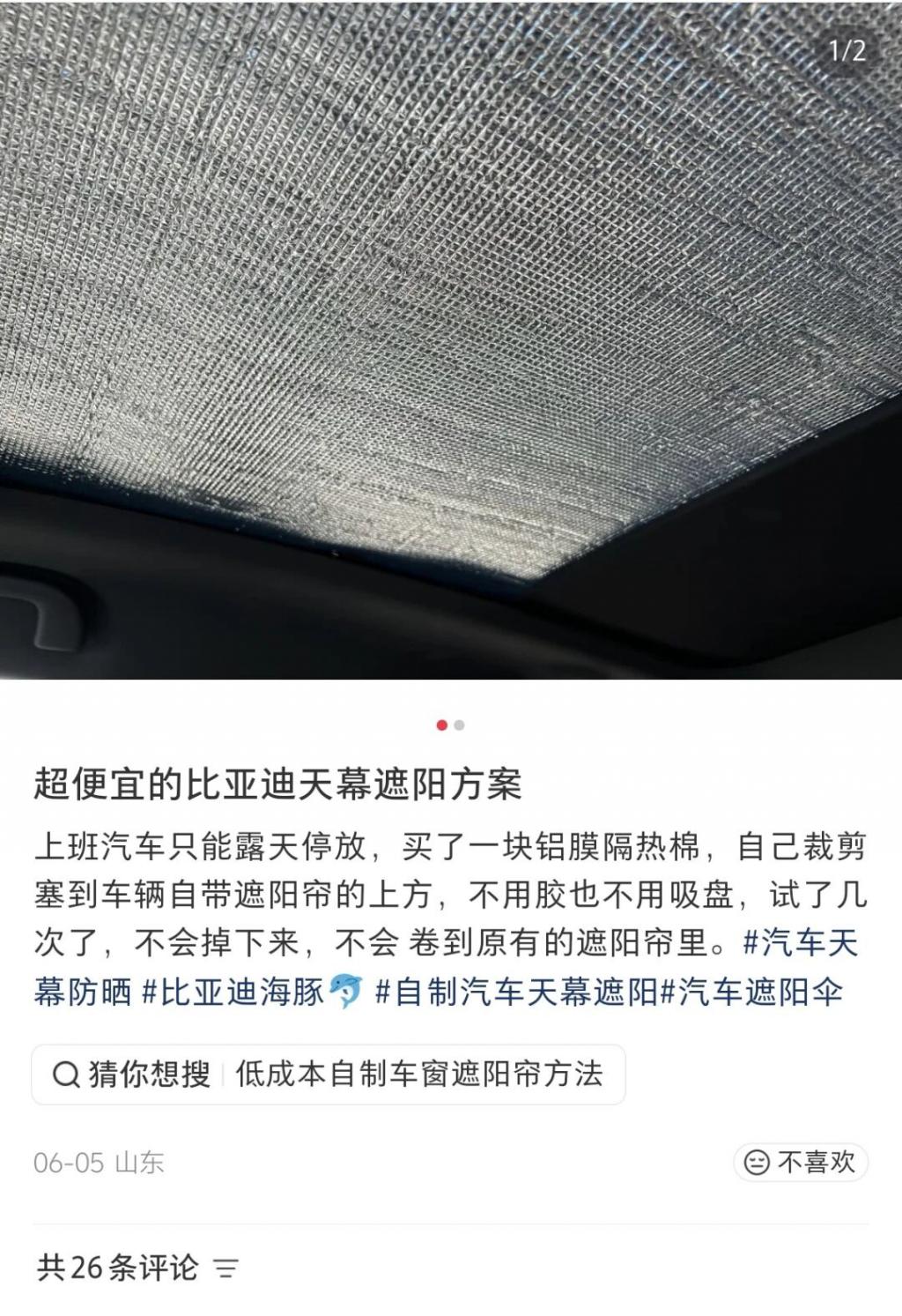 ▲社交平台上网友们分享用铝箔棉遮挡全景天幕的方案