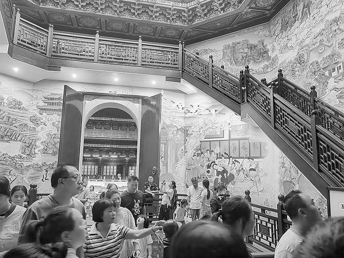 “早就听说万花楼晚上开放了,今天特意带家人来看看。这里的壁画太精美了,建筑也很有特色,感觉一下子穿越回了古代,特别有韵味。”市民李先生带着妻儿在楼内游览,脸上满是欣喜。像李先生这样的游客不在少数,有年轻情侣结伴而来,有老人带着孙辈感受文化熏陶,也有外地游客专门将其列入玉林夜游行程。大家或拍照留念,或轻声交流着对建筑与壁画的赞叹,热闹却不喧嚣,在古色古香的氛围中,形成一幅和谐的夜游图景。